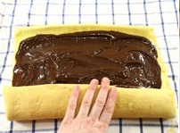 Ora possiamo riprendere il nostro rotolo di pasta, e molto delicatamente spalmiamo la crema al cioccolato su tutta la superficie, lasciando un pò di spazio nei bordi.