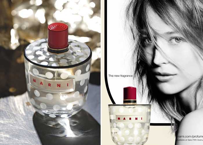 Infatti, la boccetta contente questo nuovo e primo profumo firmato Marni, ha preso ispirazione da una bottiglia che il direttore creativo del marchio, Consuelo Costuglioni, acquistò in un mercatino delle pulci molti anni fa; dalla forma tondeggiante, arricchito da pois decorativi.